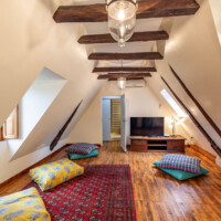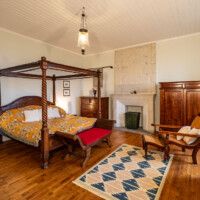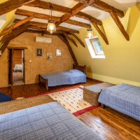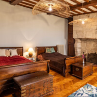 - Bedroom 2 – Extra large, high-ceilinged Family Room with 2 King’s Size beds (160), views of the valley overlooking back terrace. Wardrobe, chest of drawers. Stunning fireplace.